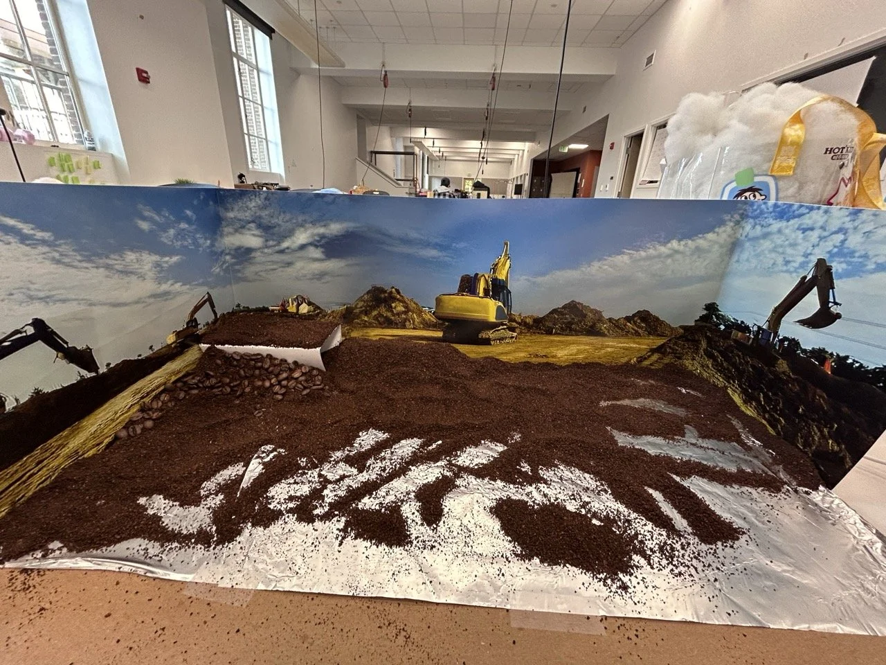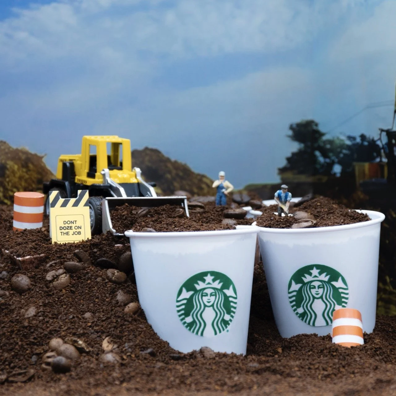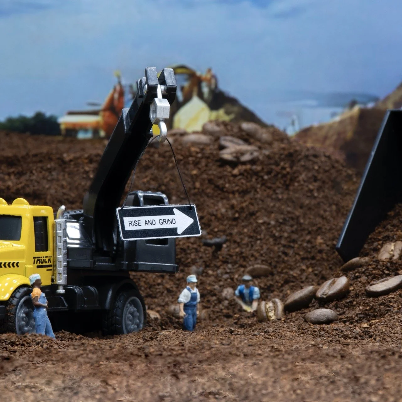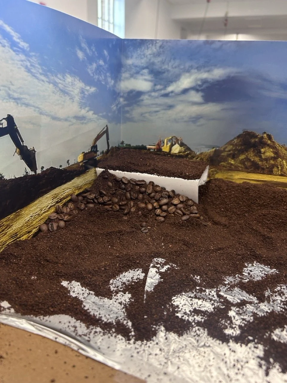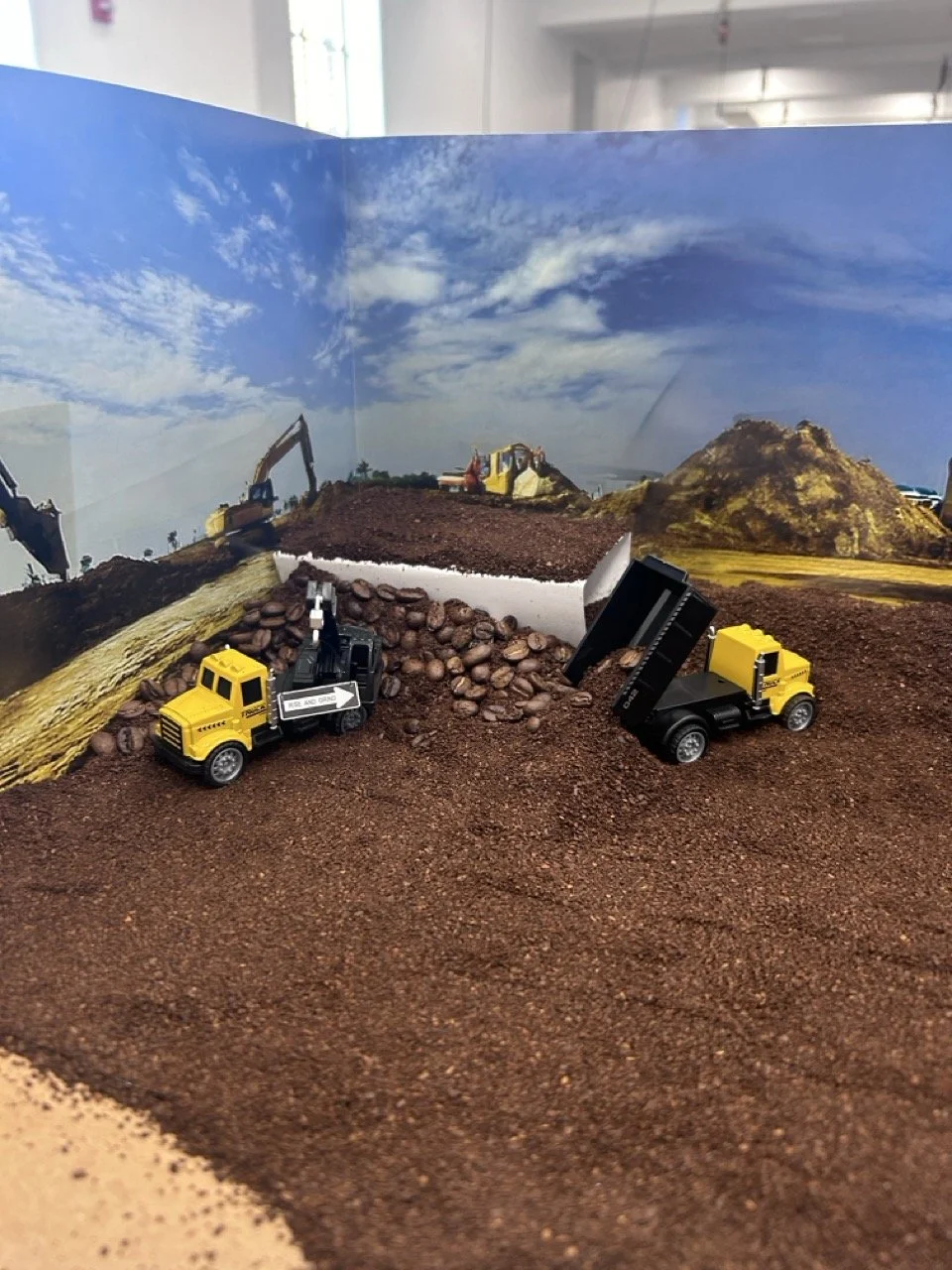 All diorama sets are constructed from coffee beans and ground coffee, toy-model heavy equipment vehicles, and 1:87 model train scale figurines.