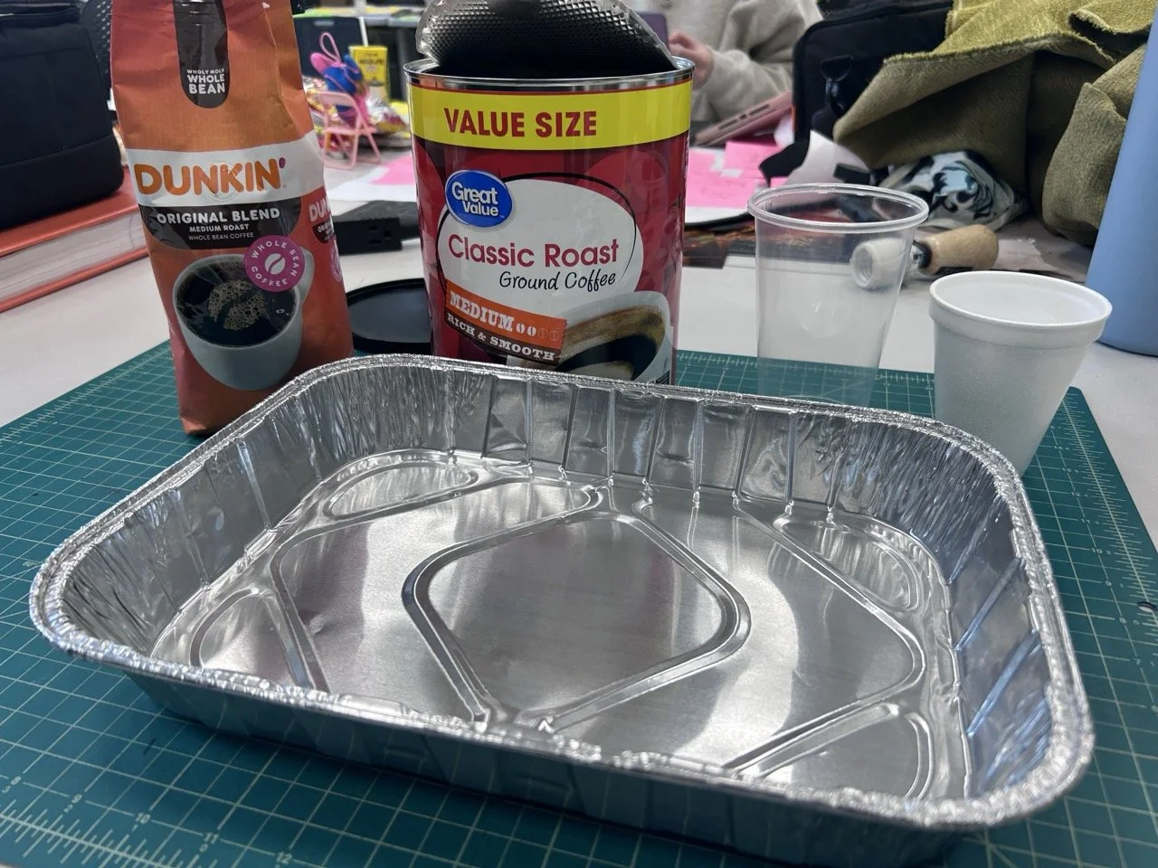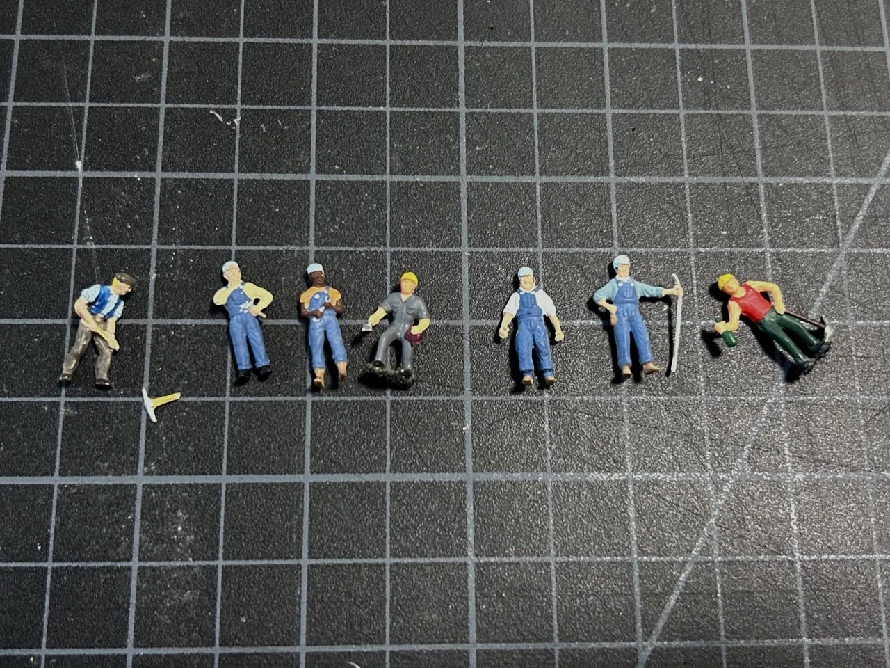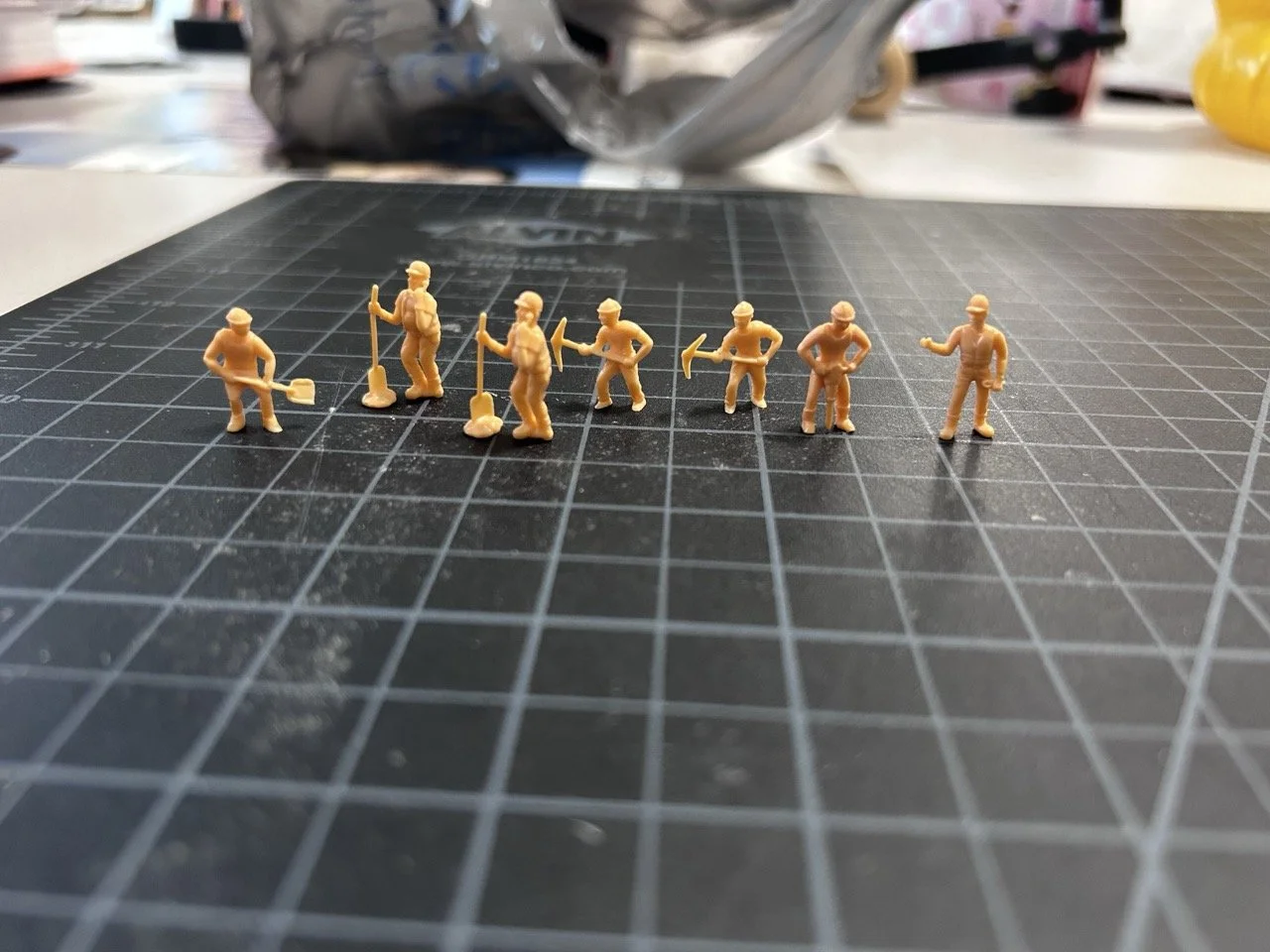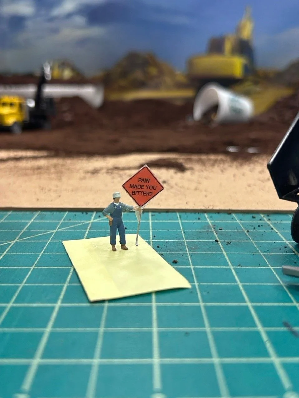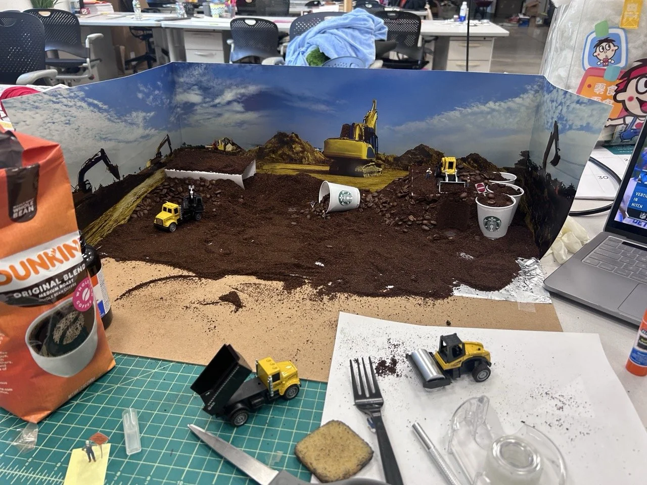 All diorama sets are constructed from coffee beans and ground coffee, toy-model heavy equipment vehicles, and 1:87 model train scale figurines.